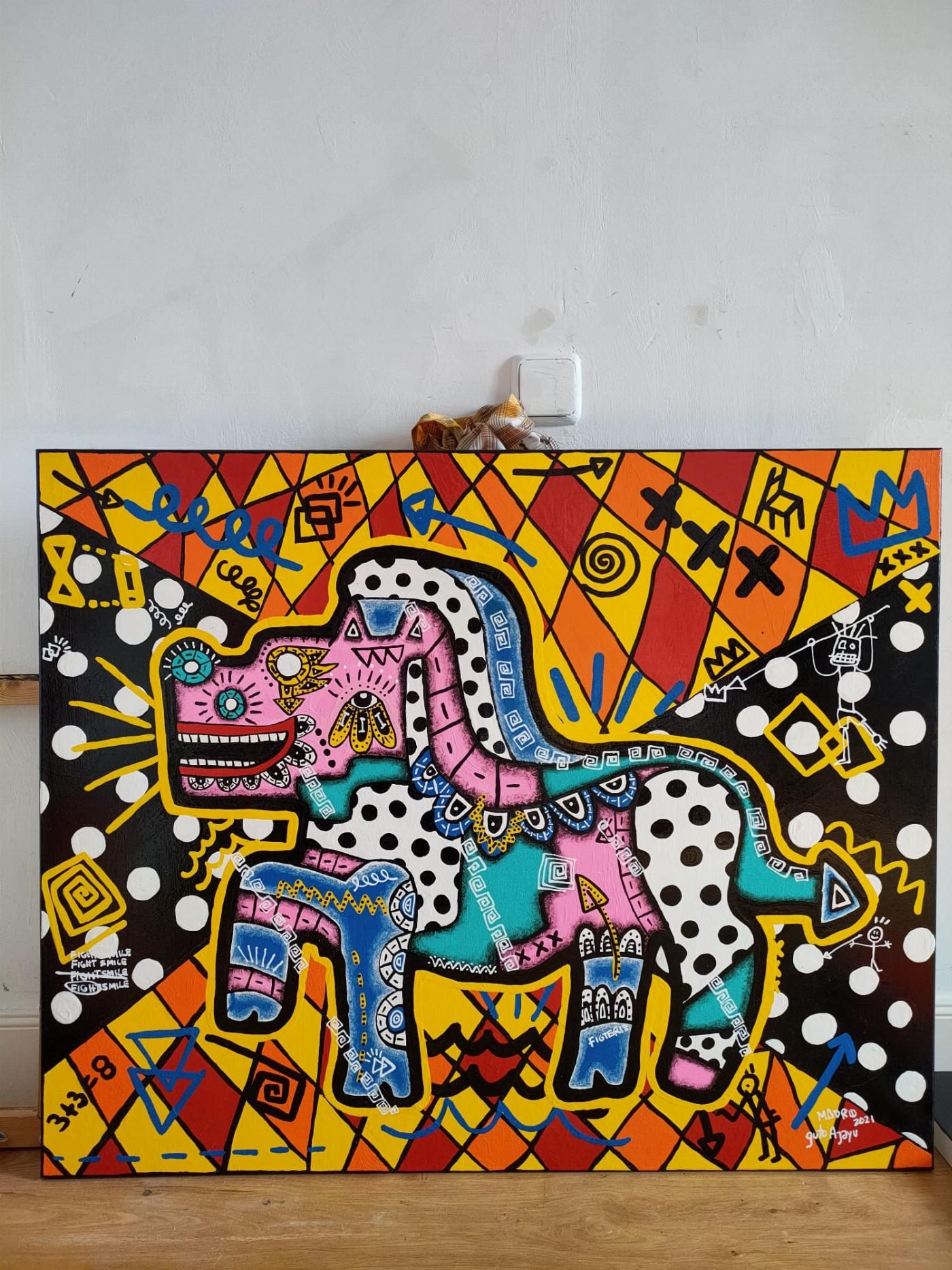 Una pieza que representa la fuerza y la resistencia de un caballo al amanecer. El sol comienza a salir y la energía del mundo vuelve a surgir! Fuerza! La pieza tiene una combinación de simbología precolombina con elementos de arte urbano. Realizada con acrílico y esmalte sobre lienzo